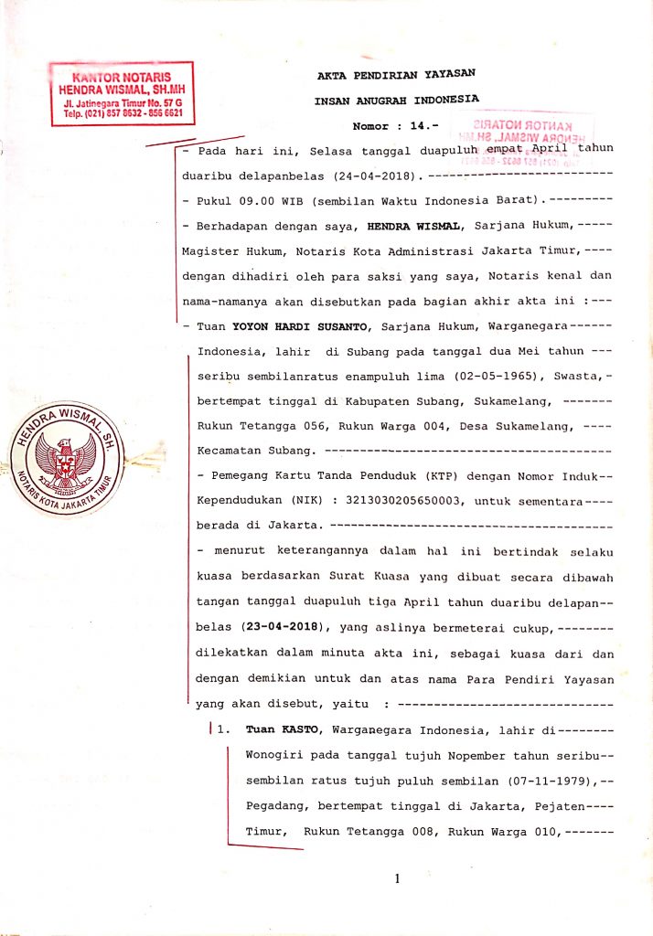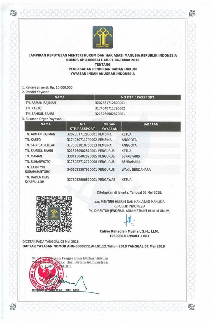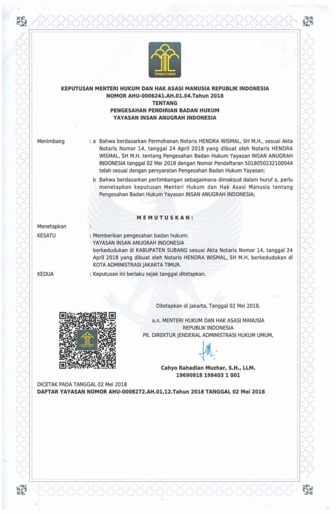Berdasarkan permohonan notaris Indra Lesmana, SH.MA sesuai akta notaris Nomor 14 tanggal 24 April 2018 yang dibuat oleh notaris Indra Wismal, SH.M.H. tentang pengesahan pendirian badan hukum Yayasan Insan Anugrah Indonesia tanggal 02 Mei 2018 dengan nomor pendaftaran 5 0 1 8 0 5 0 2 3 2 1 0 0 0 4 4 telah sesuai dengan persyaratan pengesahan badan hukum Yayasan.